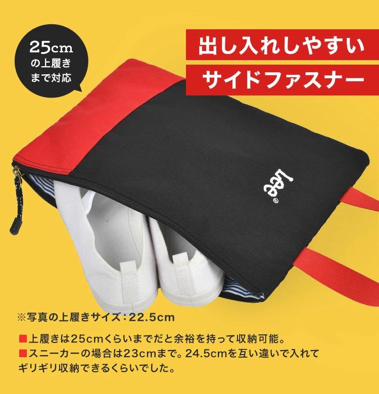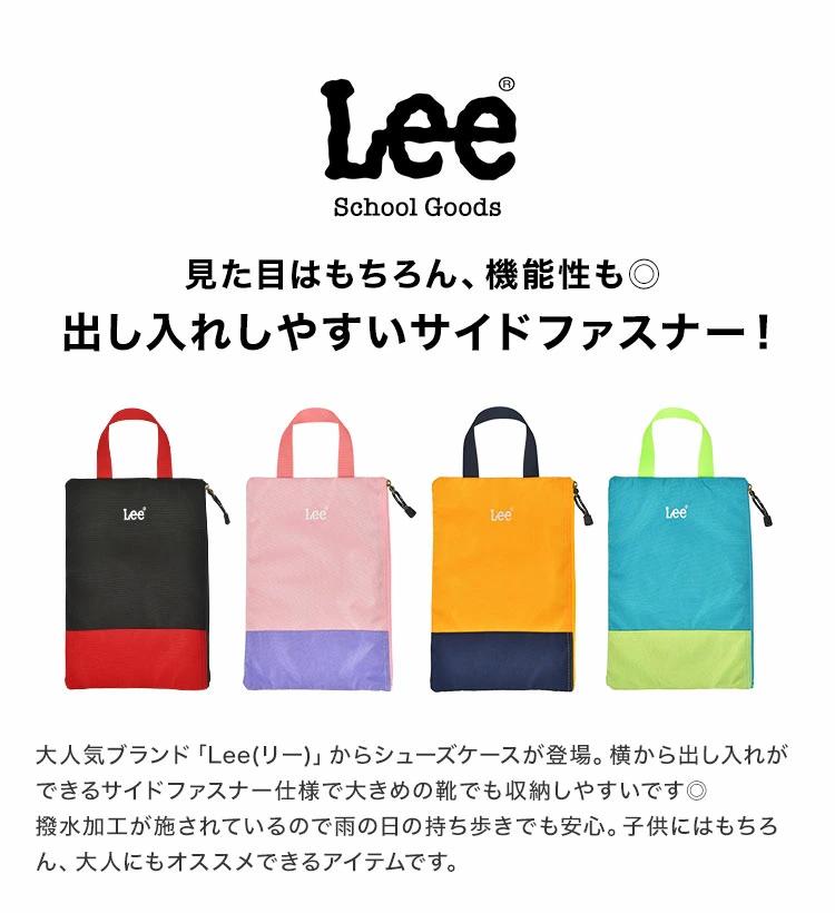 【シューズケース】大人気ブランド「Lee(リー)」の撥水シューズケース。横から出し入れができるサイドファスナー仕様で大きめの靴でも収納しやすいです◎撥水加工が施されているので雨の日の持ち歩きでも安心。子供にはもちろん、大人にもオススメできるアイテムです。