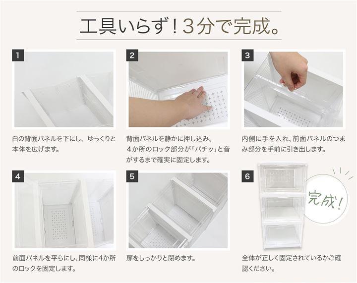 工具不要で簡単組み立てDIYが苦手な方でも大丈夫。 カチッとはめるだけで、3分ほどで組み立てられます。
