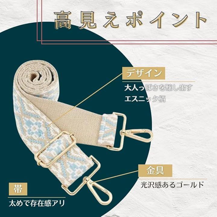 「高見えデザイン」エスニック柄のベルトで金具部分には光沢感あるゴールドを採用。