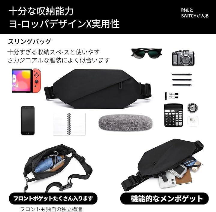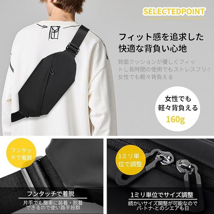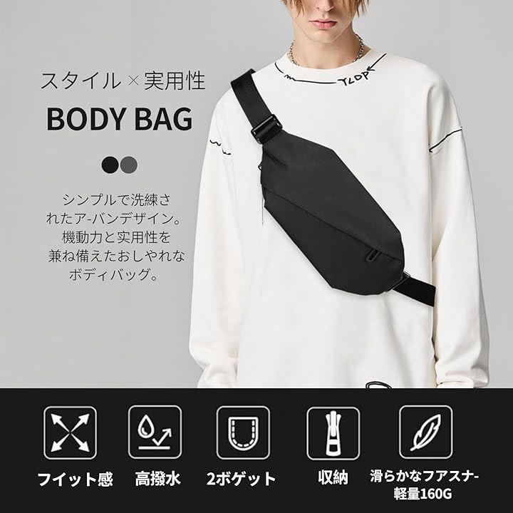 「ボディバッグの仕様」:サイズ:32cmx14cmx7cm、重量:161g、肩ベルトの長さは調整可能、素材は防水オックスフォード布を使用。
