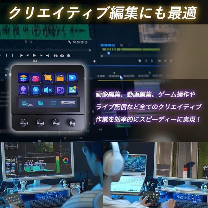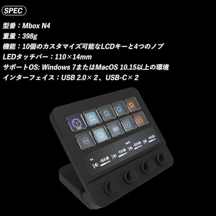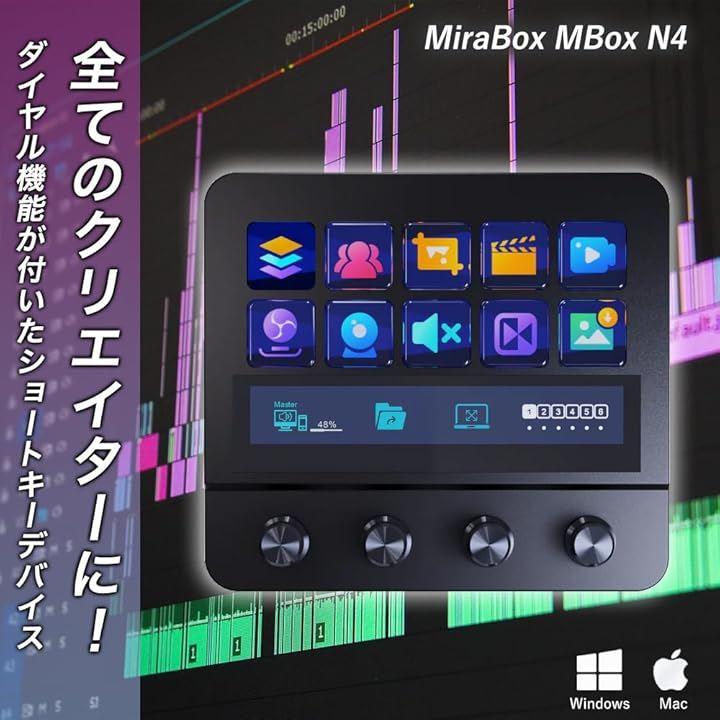 「業務効率を向上させる液晶付き新世代ショートカットキーデバイス」 「MiraBox MBox N4」は、カスタマイズ可能な10個のマクロキーと4つの360°回せるダイヤルを搭載した複雑な作業の効率を爆速にする左手デバイスです。割り当てた機能を液晶ディスプレイで確認可能で、横長タッチスクリーンでマクロを簡単に切り替えられ、専用アプリを使った直感的なドラッグ&ドロップ操作でカスタマイズが可能です。