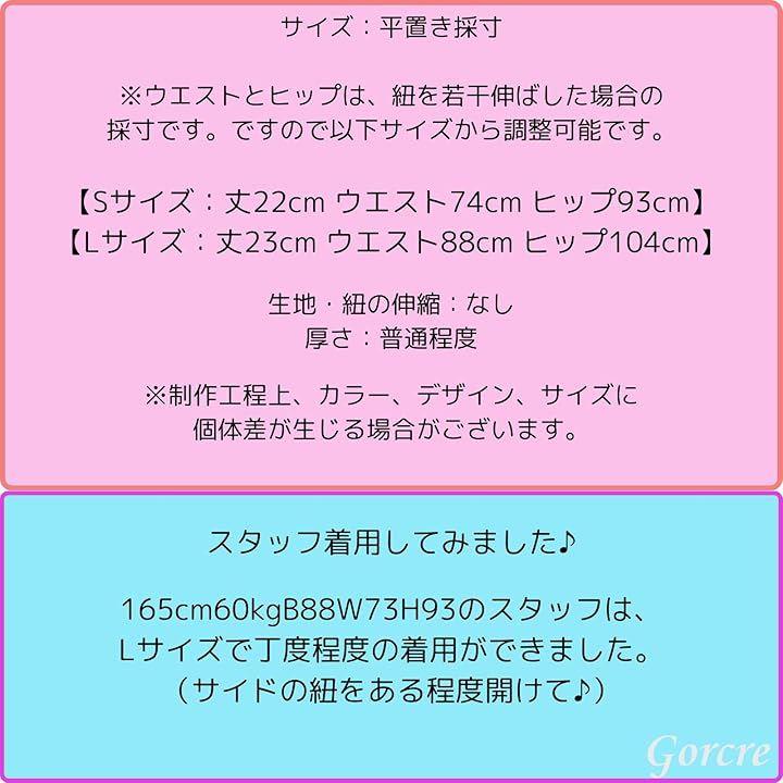 Sサイズ:丈22cm ウエスト74cm ヒップ93cm Lサイズ:丈23cm ウエスト88cm ヒップ104cm 数センチの誤差はございます。