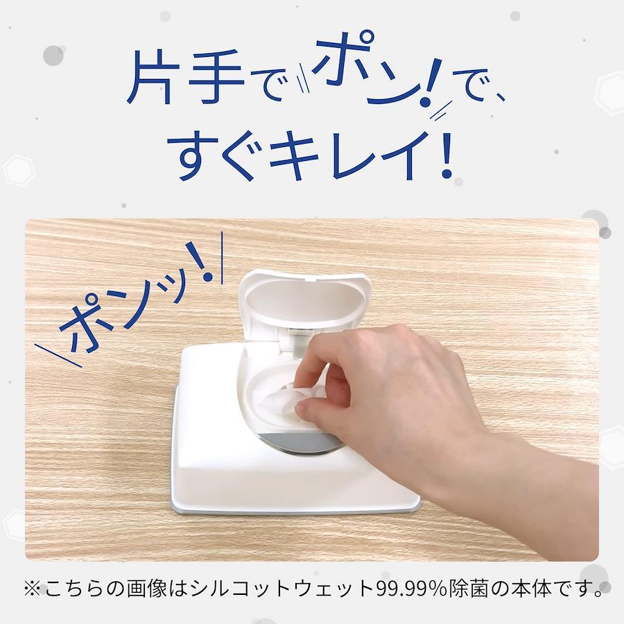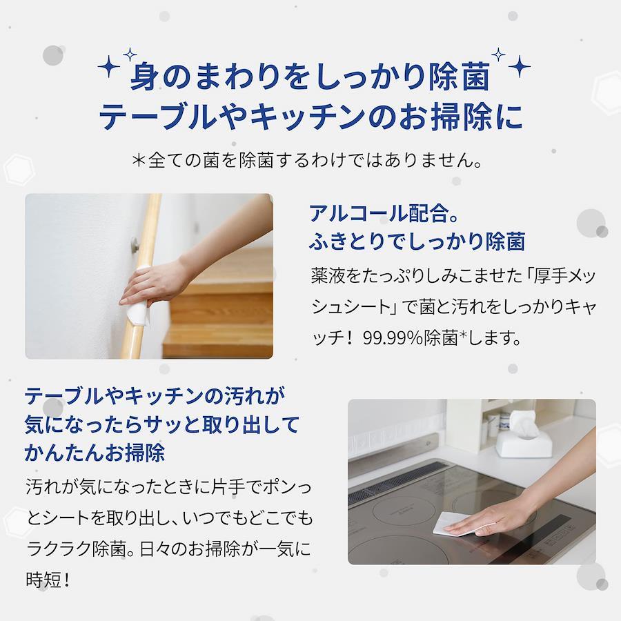 ワンプッシュでフタが開いて、片手でシートが取り出せるから、身の回りを手早くキレイにできるウェットティッシュの詰め替え用です。厚手メッシュシートでキッチン・テーブルの除菌にも。※全ての菌を除菌するわけではありません。 取っ手なしパッケージ