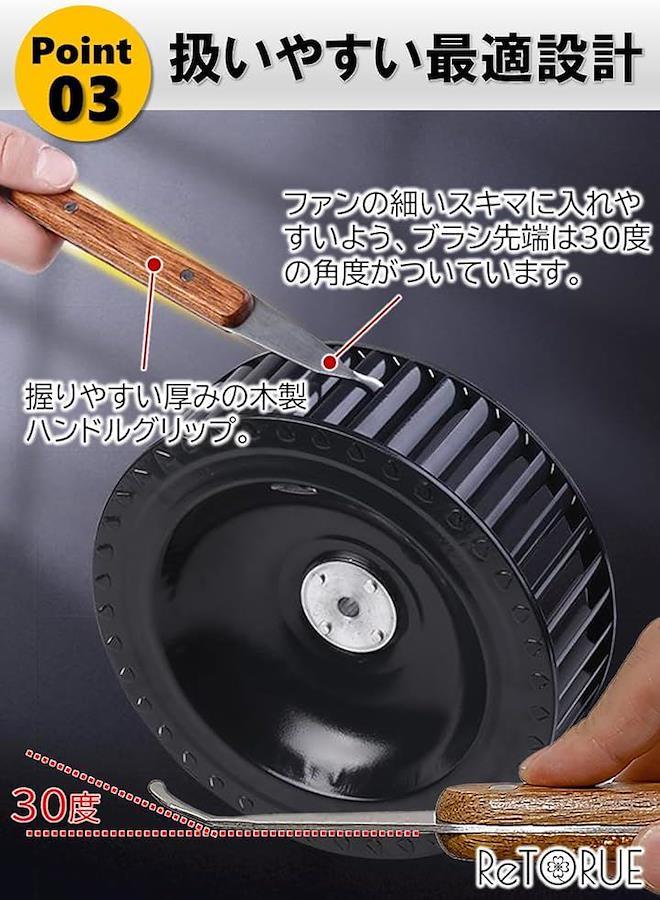 「作業にマッチした最適設計」ファンのスキマにスクレーパーが入りやすいよう、ブラシ先端は30度の角度があり、またグリップは持ちやすい厚みの木製ハンドルを使用しています。