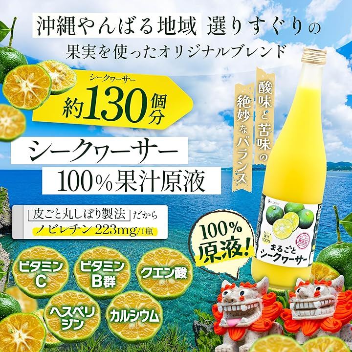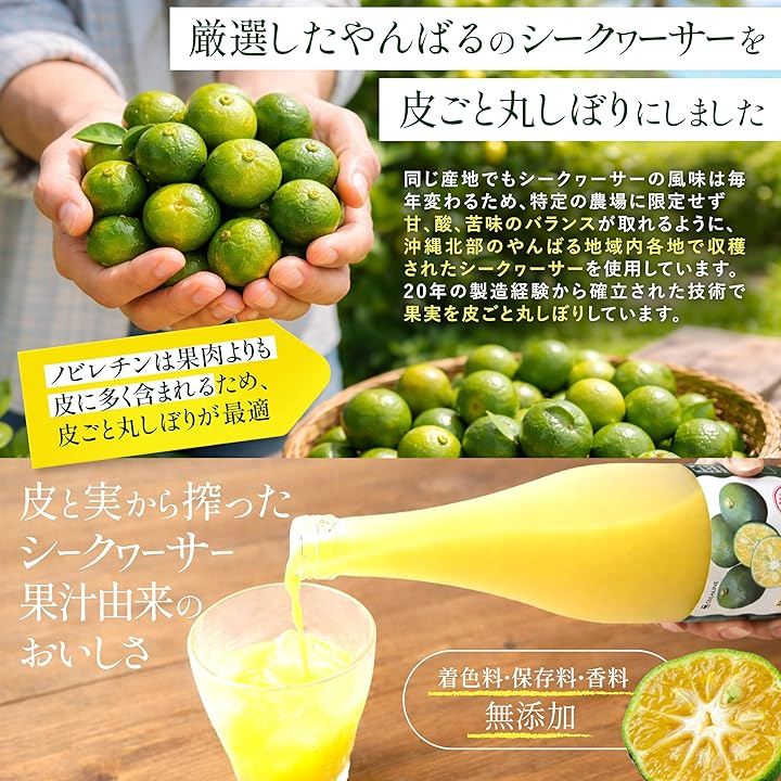 沖縄県山原(やんばる)地域の選りすぐりの果実を、1瓶に約130個分も贅沢に使用した「果汁100%シークヮーサージュース」は、皮ごと丸しぼり製法によってノビレチン223mgをはじめ、ビタミンC、クエン酸、カルシウム、ヘスペリジン、ビタミンB群といった栄養素を豊富に含み、酸味・苦味・甘味のバランスが絶妙なオリジナルブレンドの原液です。