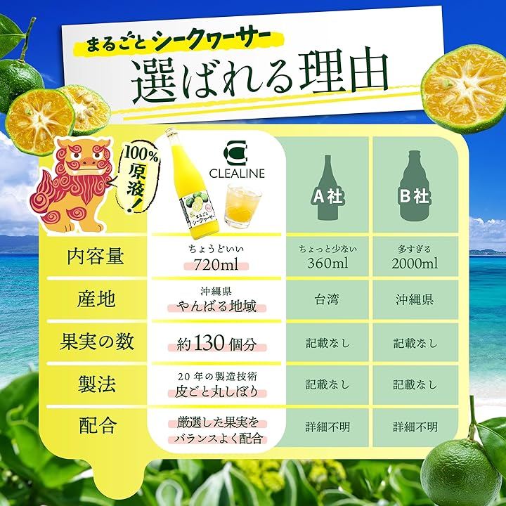 CLEALINEの「まるごとシークワーサー」が選ばれる理由は、沖縄やんばる地域の厳選された果実を20年の製造技術による「皮ごと丸しぼり製法」で仕上げた品質にあり、酸味・苦味・甘味が絶妙に調和したバランスの良い味わいと、冷蔵庫で場所を取らず毎日続けやすい「ちょうどいい720ml」という絶妙なサイズ感にあります。