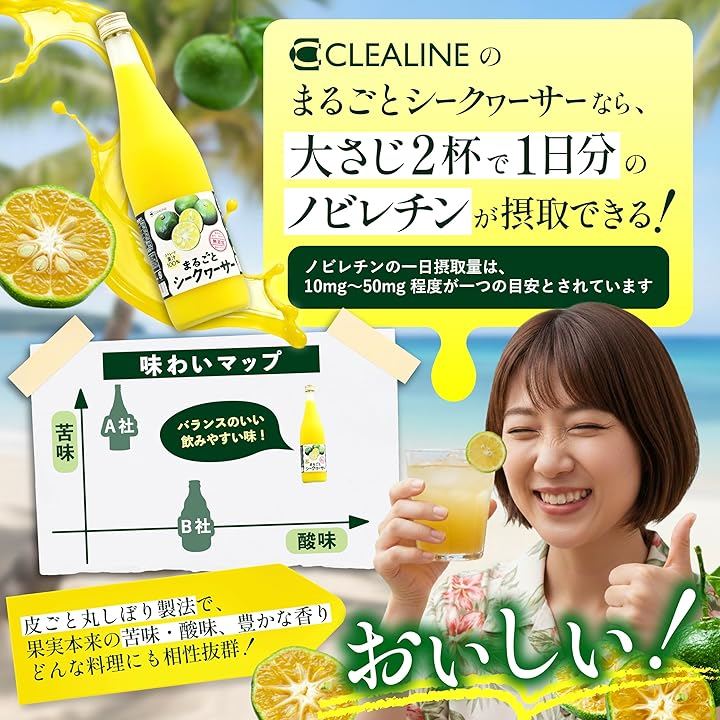 「CLEALINEのまるごとシークヮーサー」は、皮ごと丸搾り製法で果実本来の豊かな香りと酸味・苦味を絶妙に引き出しており、大さじ2杯で1日分の目安(10mg~50mg)をカバーするノビレチンを手軽に摂取できるだけでなく、魚料理や肉料理との相性も抜群です。