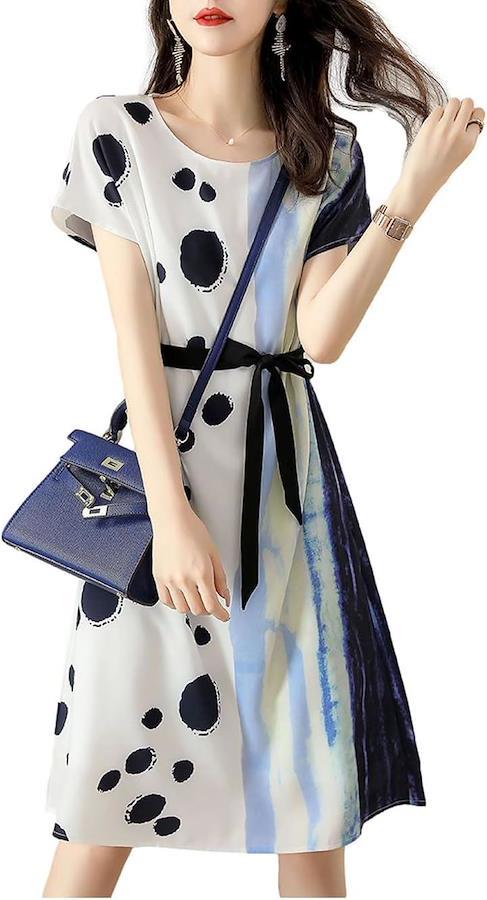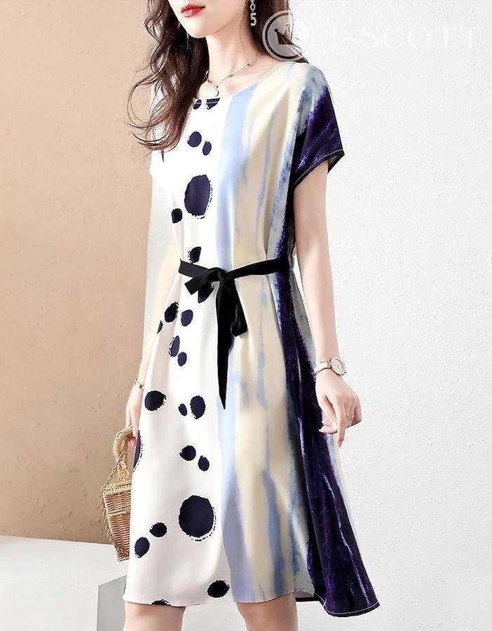 「心浮き立つ爽やかなプリントワンピース」 ホワイト、ブルー、ブラックのコントラストが、爽やかで軽快な印象のワンピース。
