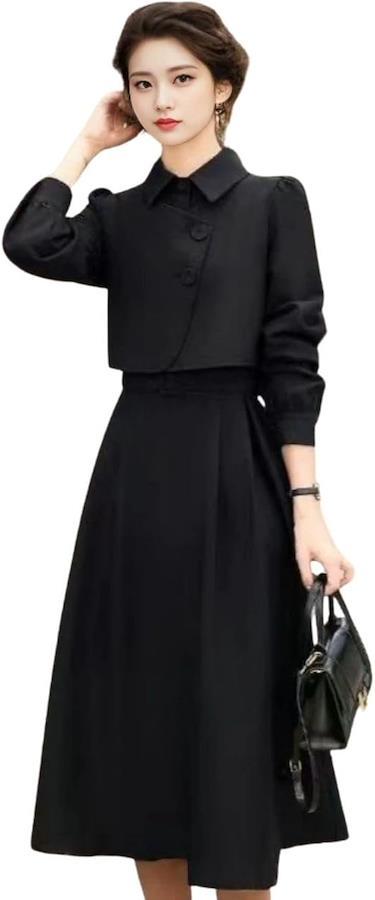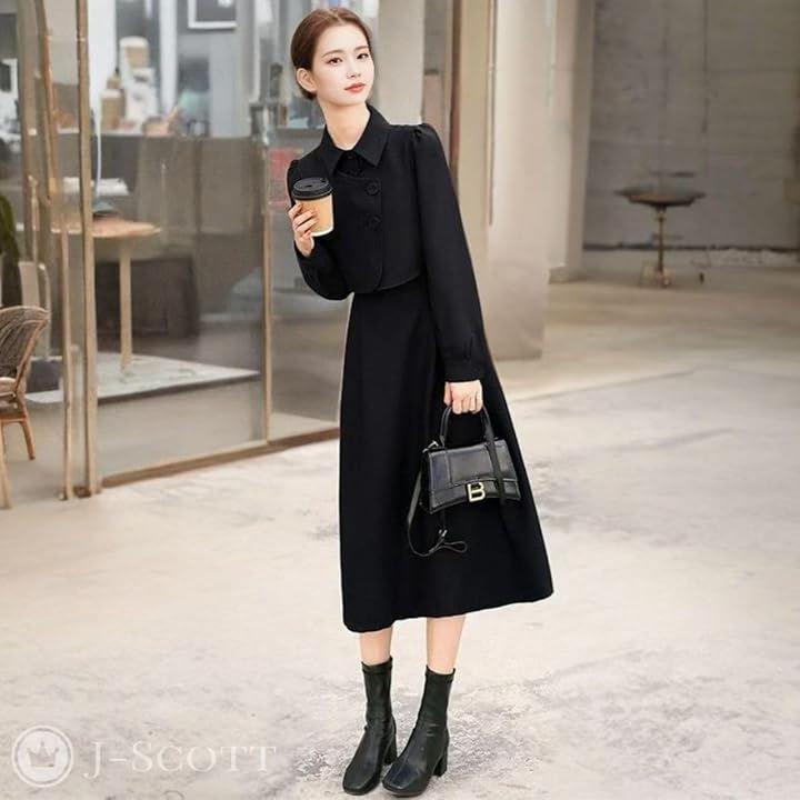 「シンプルなカラートーンが着こなしを引き立てる」 ポリエステルのツイル生地が扱いやすい、ベスト付きワンピース。