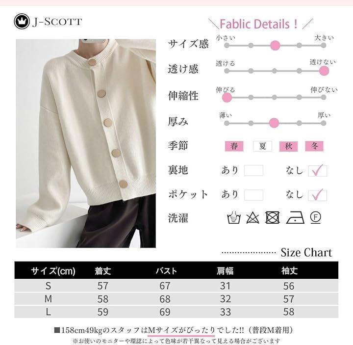 着丈/バスト/肩幅/袖丈 S: 57/67/31/56 M: 58/68/32/57 L: 59/69/33/58 *158cm/49kgのスタッフの場合:Mがジャストサイズでした(普段M着用)