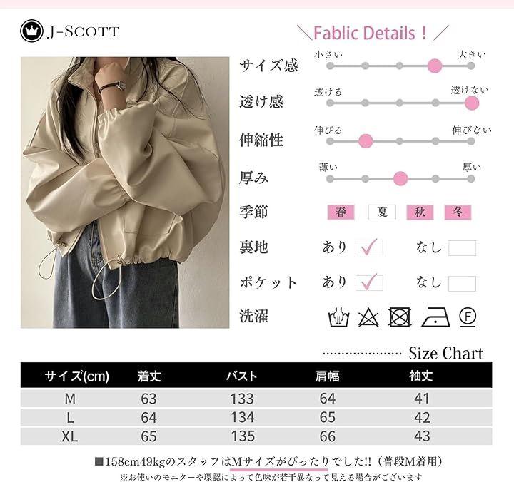 着丈/バスト/肩幅/袖丈 M: 63/133/64/41 L: 64/134/65/42 XL: 65/135/66/43 *158cm/49kgのスタッフの場合:Mがジャストサイズでした(普段M着用)