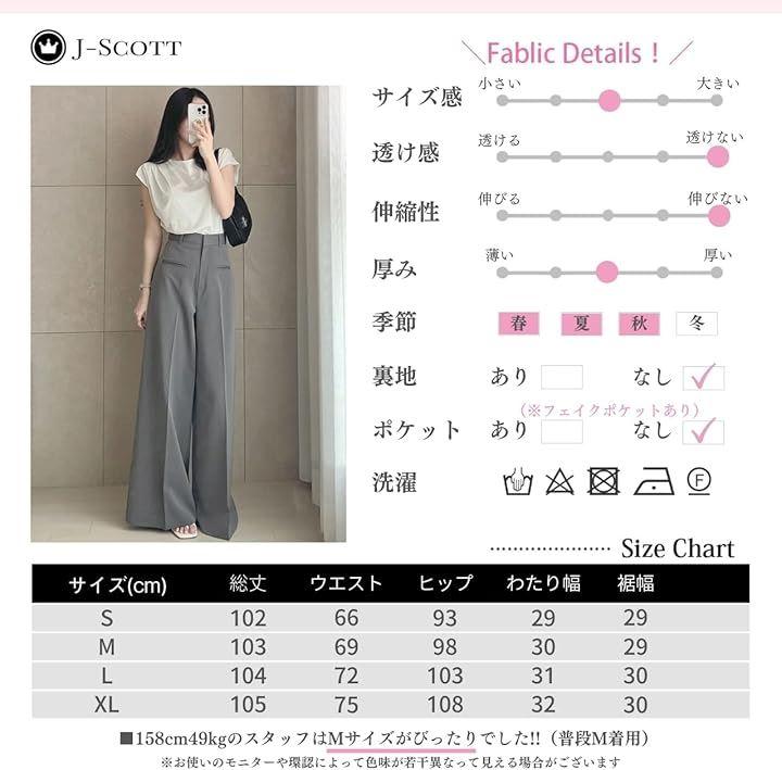 総丈/ウエスト/ヒップ/わたり幅/裾幅 S:102/66/93/29/29 M:103/69/98/30/29 L:104/72/103/31/30 XL:105/75/108/32/30 *158cm/49kgのスタッフの場合:Mがジャストサイズでした(普段M着用)