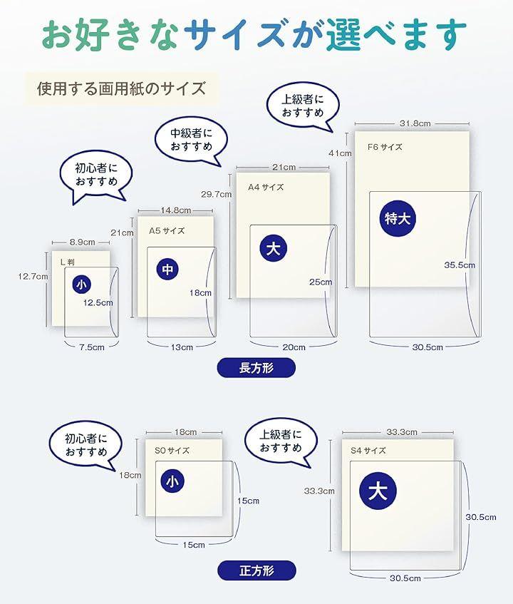 多くのバリエーションの中からご自身の作品に合ったサイズを選ぶことができます。