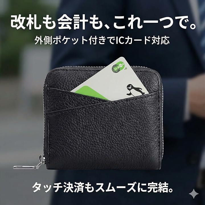 「改札も会計もこれ一つで」 便利な外ポケットを搭載しており、交通系ICカード(SUICA等)を入れれば、改札やタッチ決済もスムーズ。