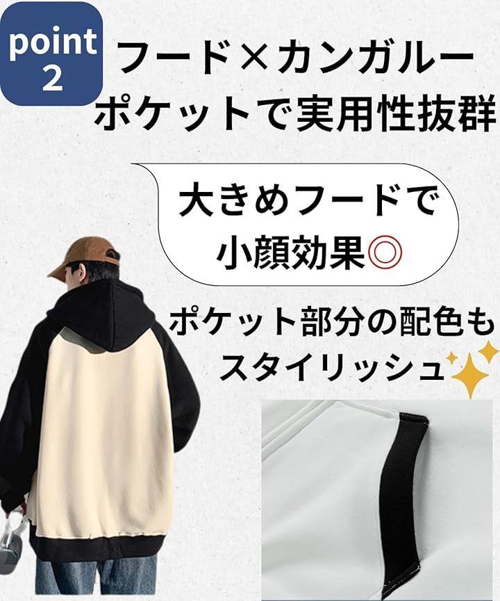 両サイドに配置されたカンガルーポケットは、スマホや財布、小物を収納するのに便利です。