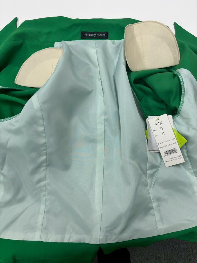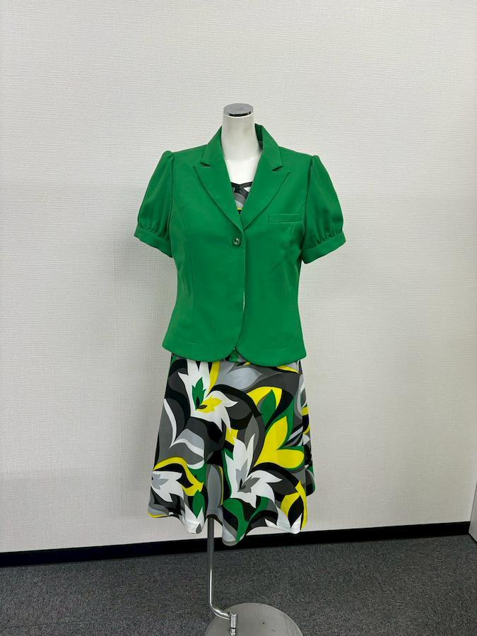 「素材・サイズ・お手入れ方法」★ジャケット:ポリエステル100%(洗濯機OK)サイズ11号:バスト95㎝,肩布37㎝,着丈50㎝,袖丈22.5㎝★キャミソール:ポリエステル100%(手洗い)サイズ9号:バスト87㎝,着丈36㎝★スカート:ポリエステル100%(手洗い)サイズ9号:ウエスト65㎝,ヒップ106㎝,スカート丈56㎝