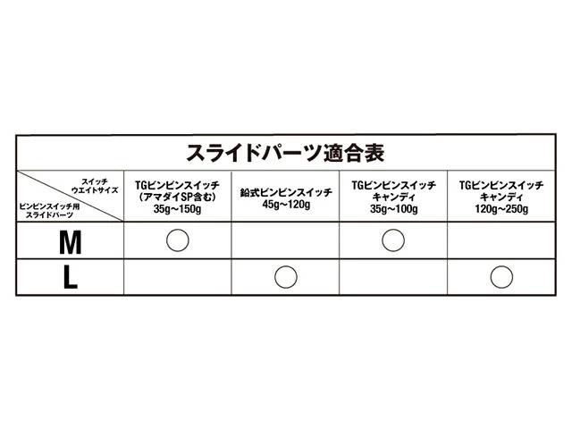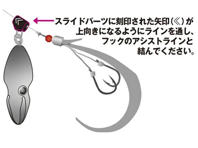 ビンビンスイッチに採用されている純正スライドパーツです。遊動式でラインを中に通してフックとネクタイ、バックファイヤーキャップをセットすることで、フックの角度とボディとの間隔の最適化を実現。