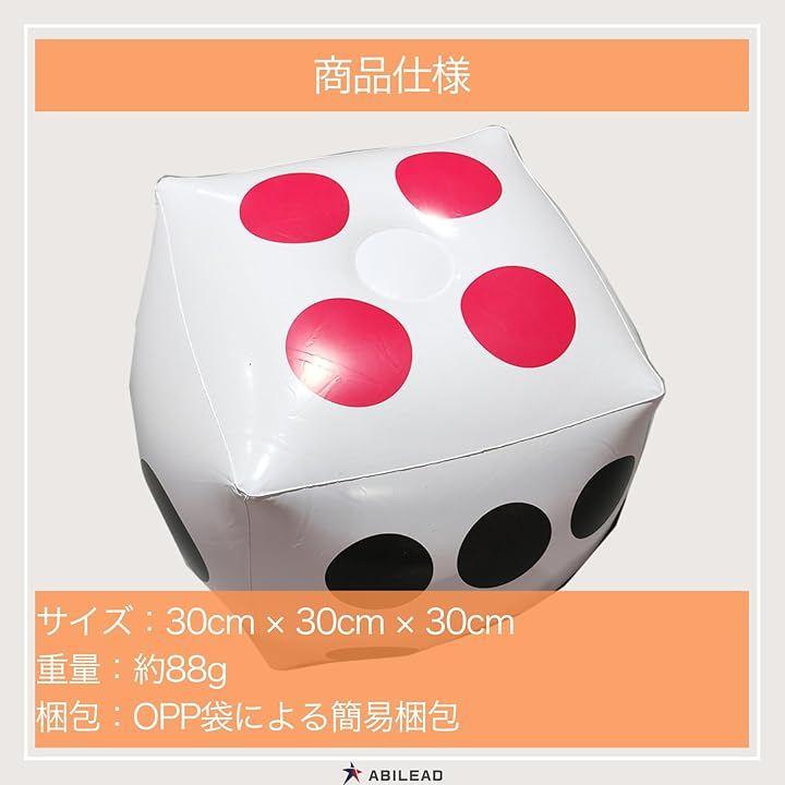 「商品仕様」サイズ:約30x30x30cm、材質:PVC、屋内外対応(パーティ商品のため対面は7に揃いません)、カラー:本体は白色、サイコロの目の色は黒色と赤色の2色配色です。