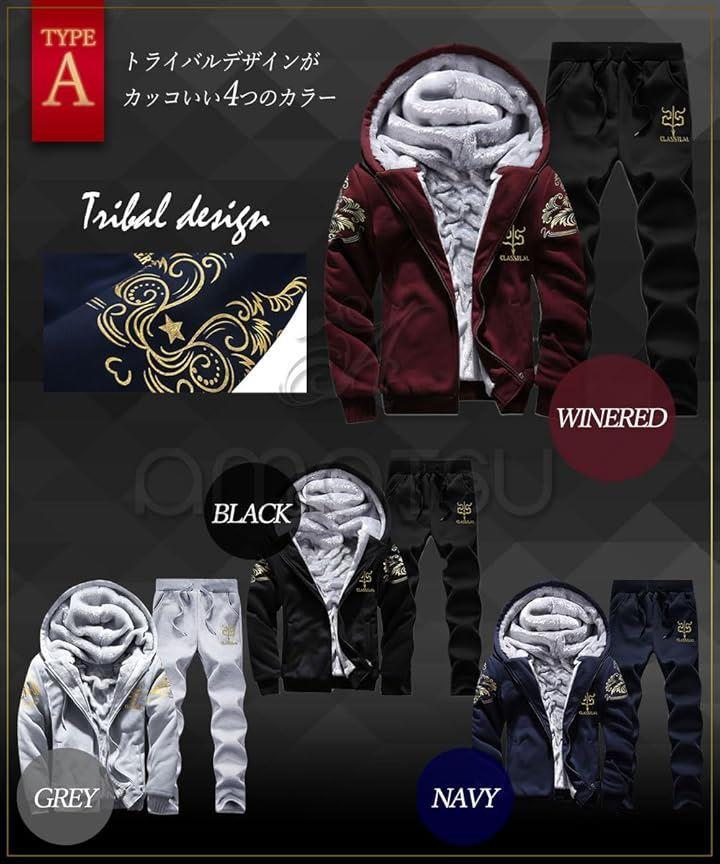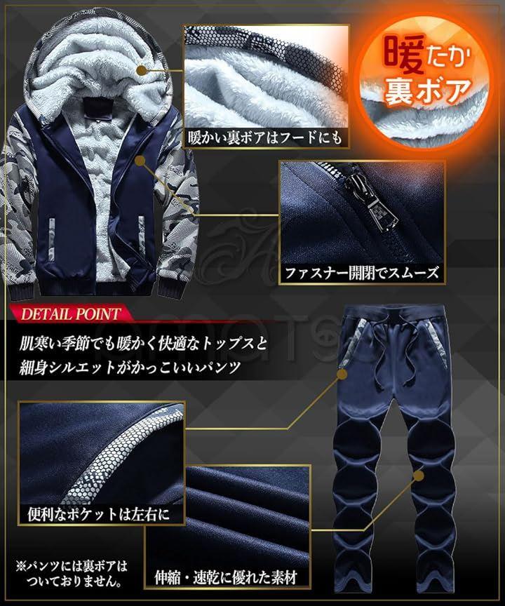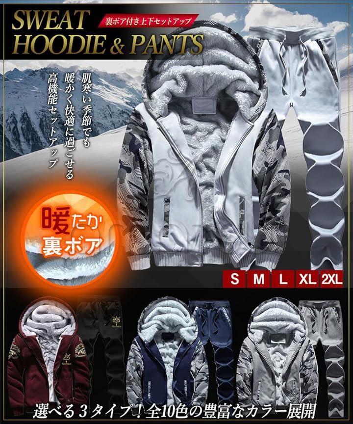 「裏ボア付き上下セットアップ」存在感のあるタトゥー柄、カモフラージュ柄、ロゴプリント柄が印象的なカジュアルな上下セットアップ。