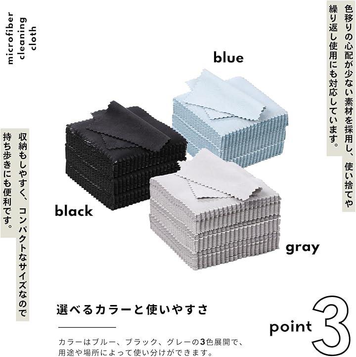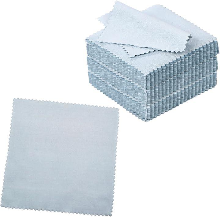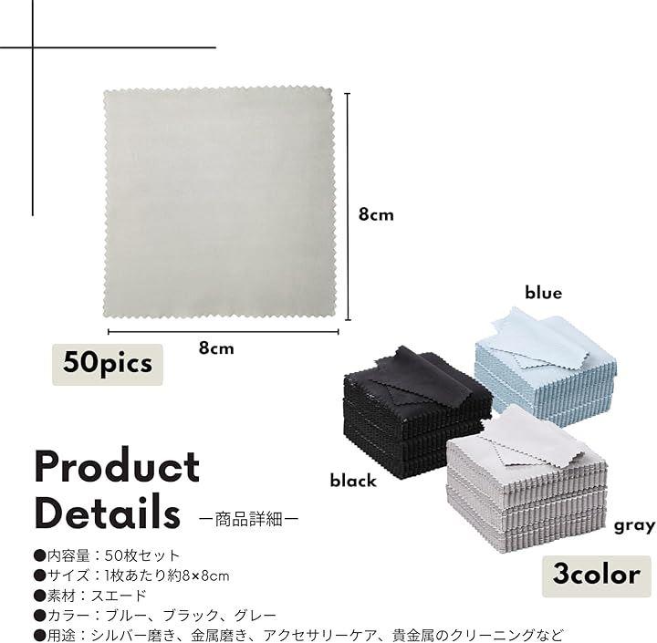 「商品詳細」 内容量:50枚セット サイズ:1枚あたり約8x8cm 素材:スエード カラー:ブルー、ブラック、グレー 用途:シルバー磨き、金属磨き、アクセサリーケア、貴金属のクリーニングなど