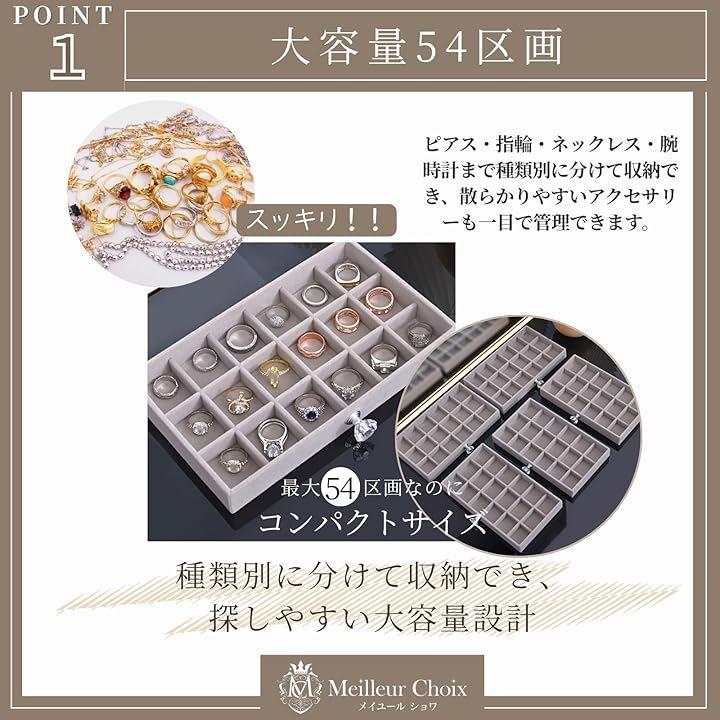 コンパクトなサイズながら54区画(*仕切り調整可)を備え、ピアス・指輪・ネックレス・腕時計まで種類別にすっきり整理できます。