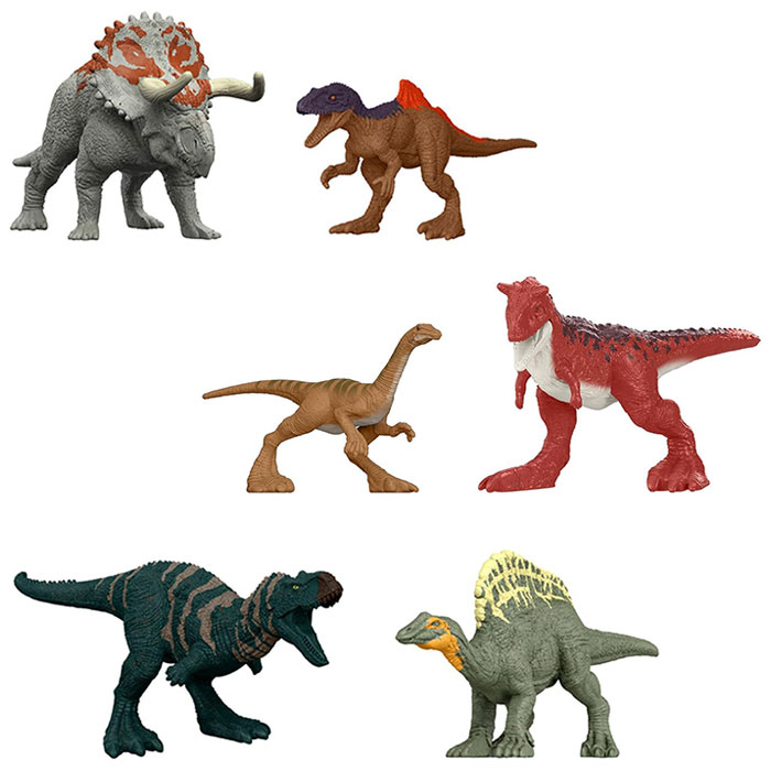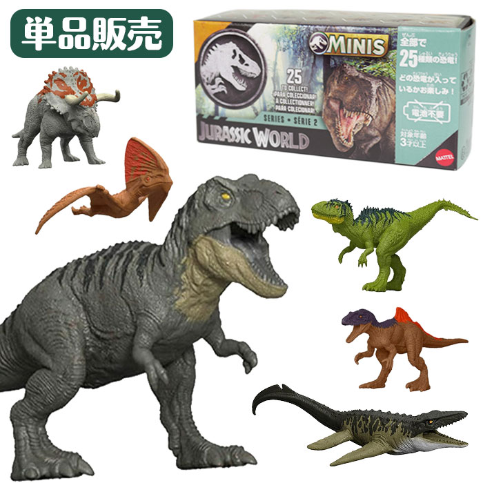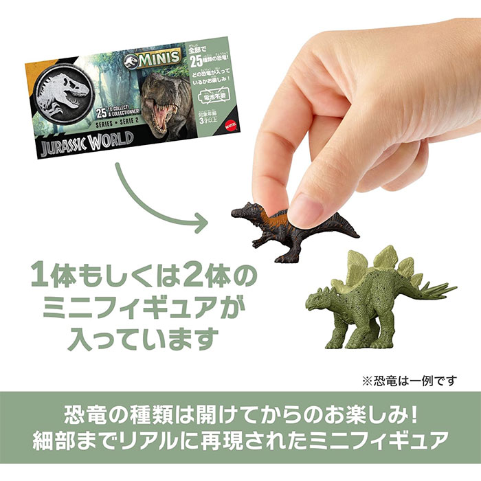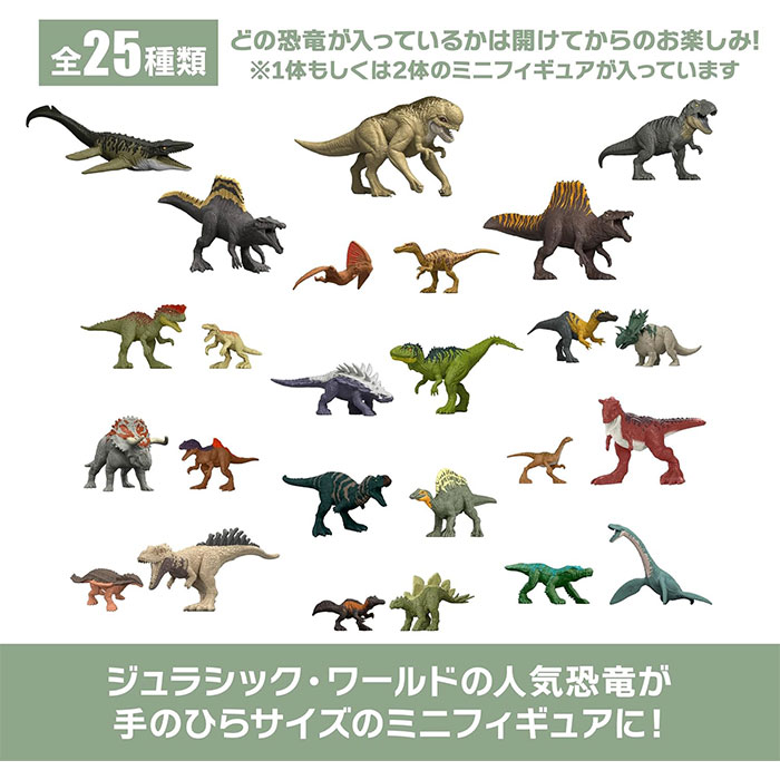 全25種類、15パターンの組み合わせで、中の恐竜の種類が分からないブラインドボックス仕様です!1箱に、「超大型1体」「大型1体+小型1体」「中型2体」のミニフィギュアが入っています。