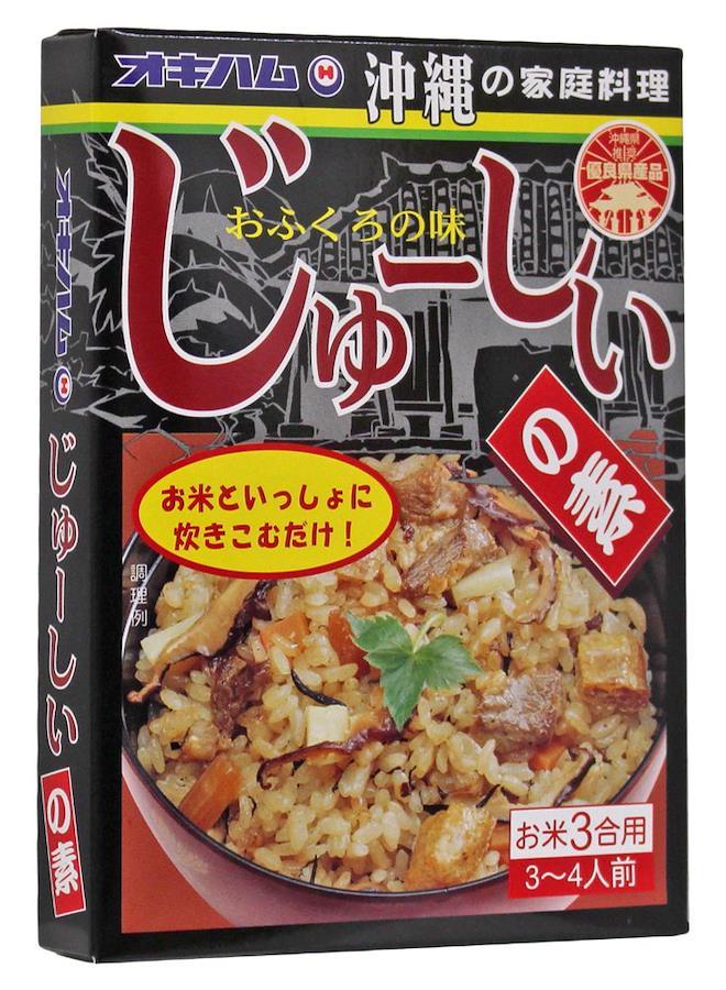 じゅーしぃとは野菜や豚肉が入った、沖縄風炊き込みご飯。お米3合と一緒に炊くだけで手軽に美味しい沖縄の味がお楽しみ頂ける。沖縄県優良県産品推奨品。