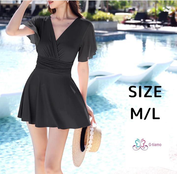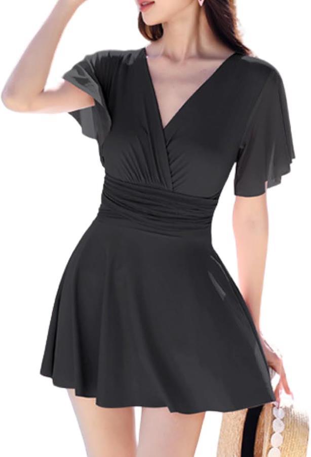 着るだけでサマになるワンピース型の水着、パンツ一体型でめくれても安心です カシュクールのデザインとV字カットネックでデコルテラインがとってもキレイ