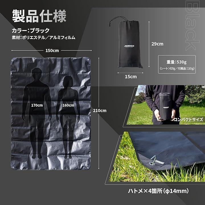 「サイズ」展開時:150x210cm(1~3人用)|収納時:15x6x29cm(重量:530g /シート本体420g+付属品110g)