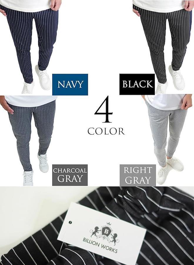 こちらをコンセプトとしてスリムなデザインで履きまわしやすいメンズスウェットパンツを、タイトシルエットにしたストライプパンツ。