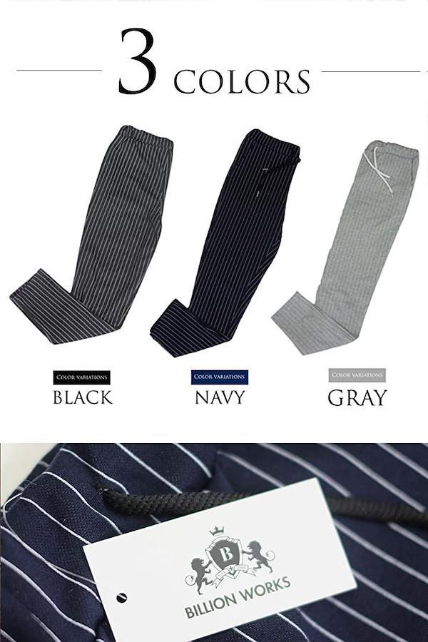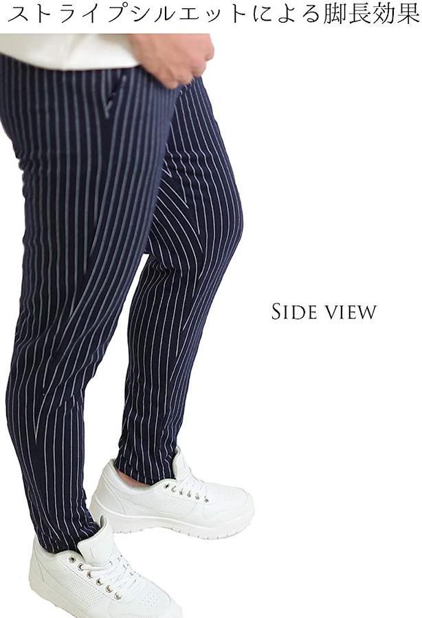 ストライプデザインと太ももから裾にかけて細くなっていくテーパードシルエットを採用により脚長効果を実現。
