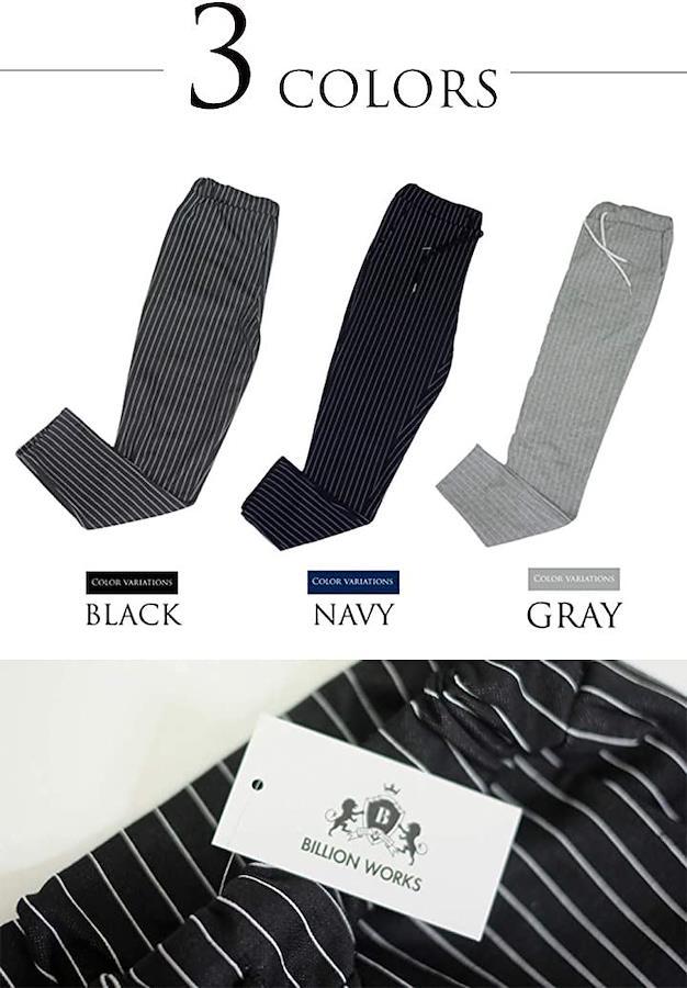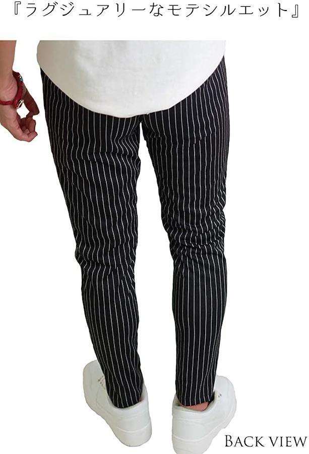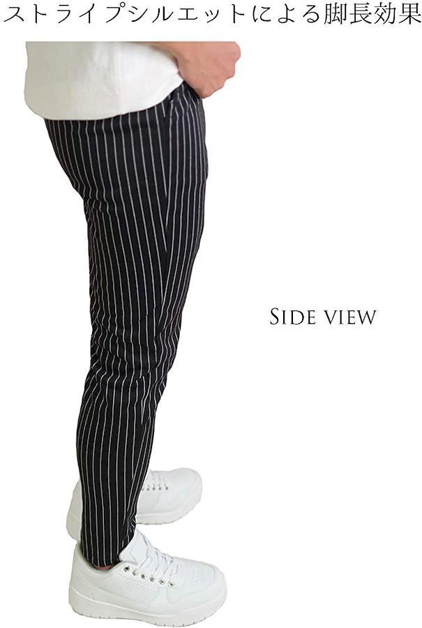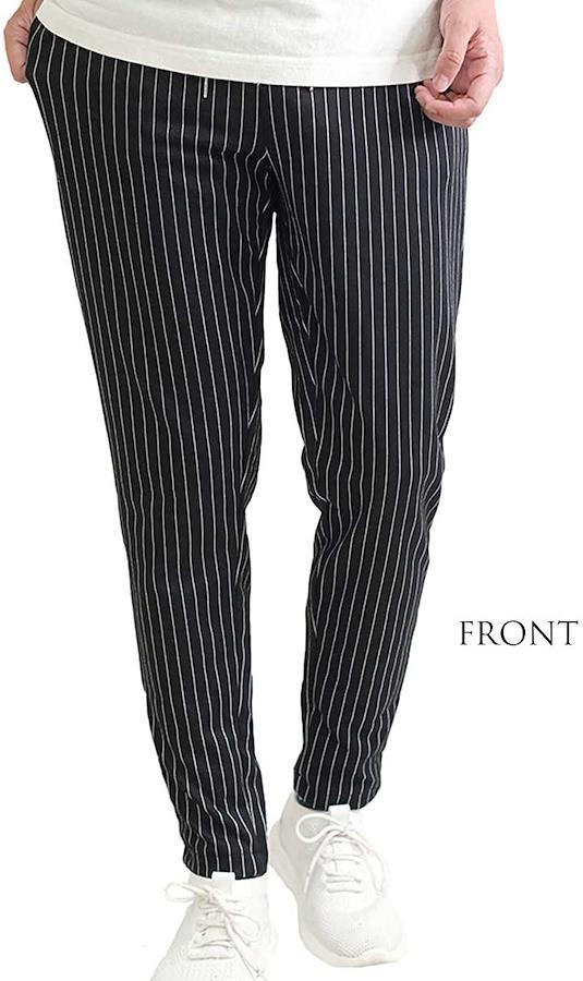 ストライプデザインと太ももから裾にかけて細くなっていくテーパードシルエットを採用により脚長効果を実現。