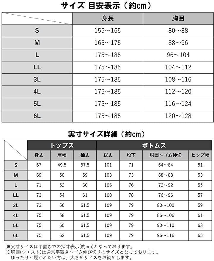 ・<サイズ> M(身長165-175cm、胸囲88-96cm) L(身長175-185cm、胸囲96-104cm) LL(身長175-185cm、胸囲104-112cm) 3L(身長175-185cm、胸囲108-116cm) 4L(身長175-185cm、胸囲112-120cm) 5L(身長175-185cm、胸囲116-124cm) <素材>本体:ポリエステル100% リブ部分:ポリエステル95%、ポリウレタン5%