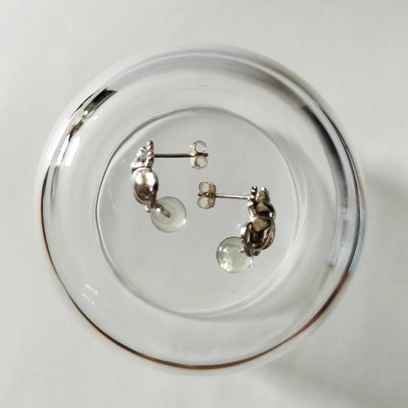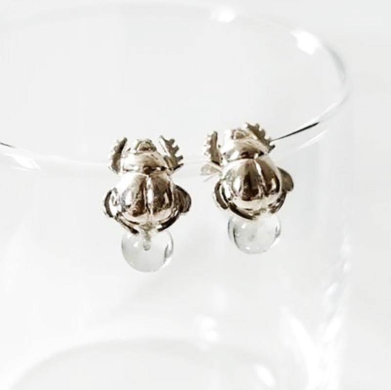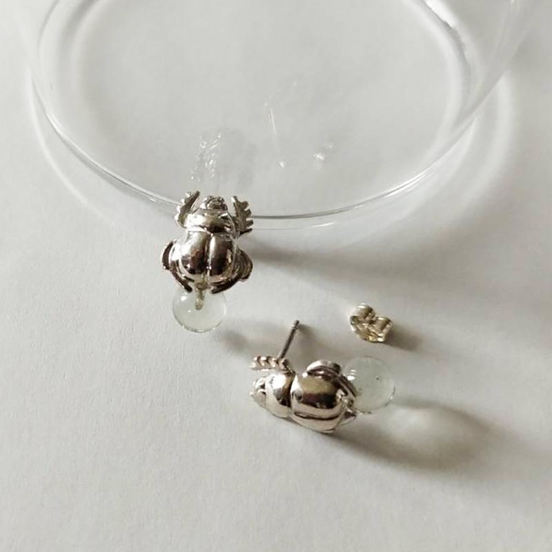 グリーンアメジストを転がすスカラベのピアスです。耳の下から覗くグリーンアメジストがほんのり色づき、オシャレな雰囲気です。