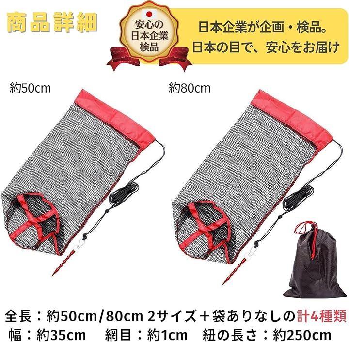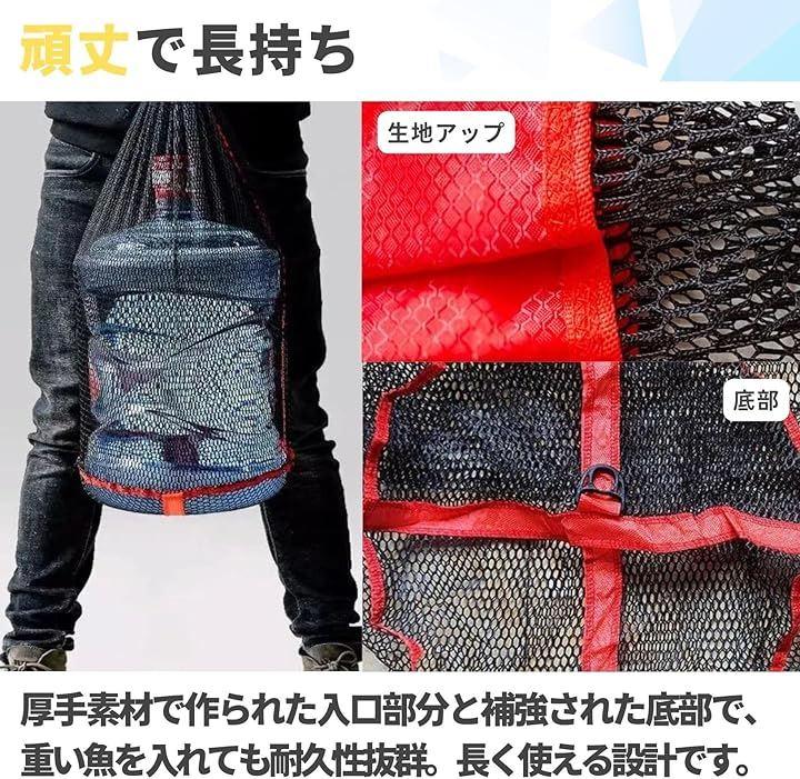 頑丈な厚手素材の入口と補強された底部、そして二重ロックの紐で魚の逃げ出しを防ぎます。