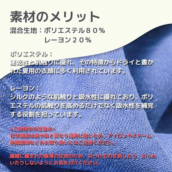 「質感」ポリエステル と レーヨン の混合生地で、さらっとひんやりした質感は 夏 の暑い時期にも心地よい肌触りです。