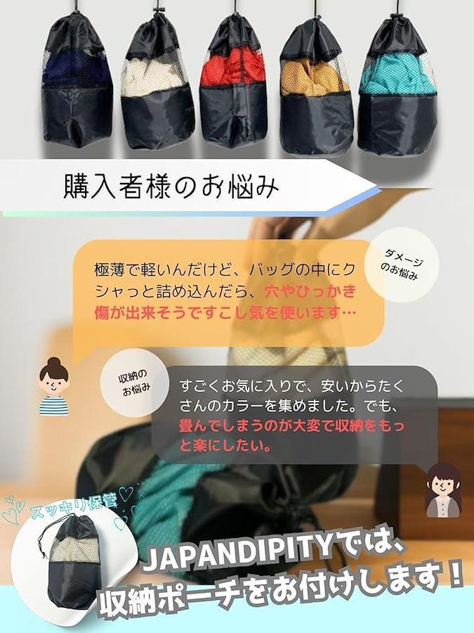 JAPANDIPITY の 大判 ガーゼ ストールには収納ポーチがついてくる。同じようなお値段ならば、断然収納ポーチ付きがオススメ。収納の手間やダメージの心配が大幅に減って、よりながーーーくご愛用頂けます。