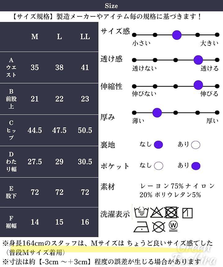 「仕様」◉素材:レーヨン75% ナイロン20% ポリウレタン5% ◉サイズ:ウエスト/前股上/ヒップ/わたり幅/股下/裾幅 cm「M」35/21/44.5/27.5/72/14 「L」38/22/47.5/29/72/15 「LL」41/23/50.5/30.5/72/16 全て平置きで測定しております。