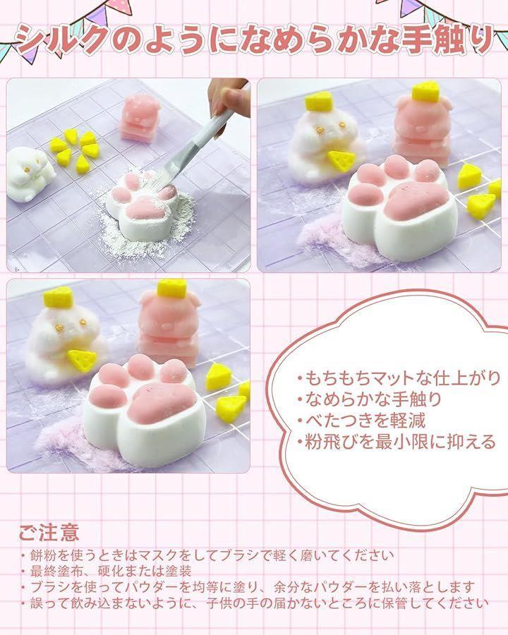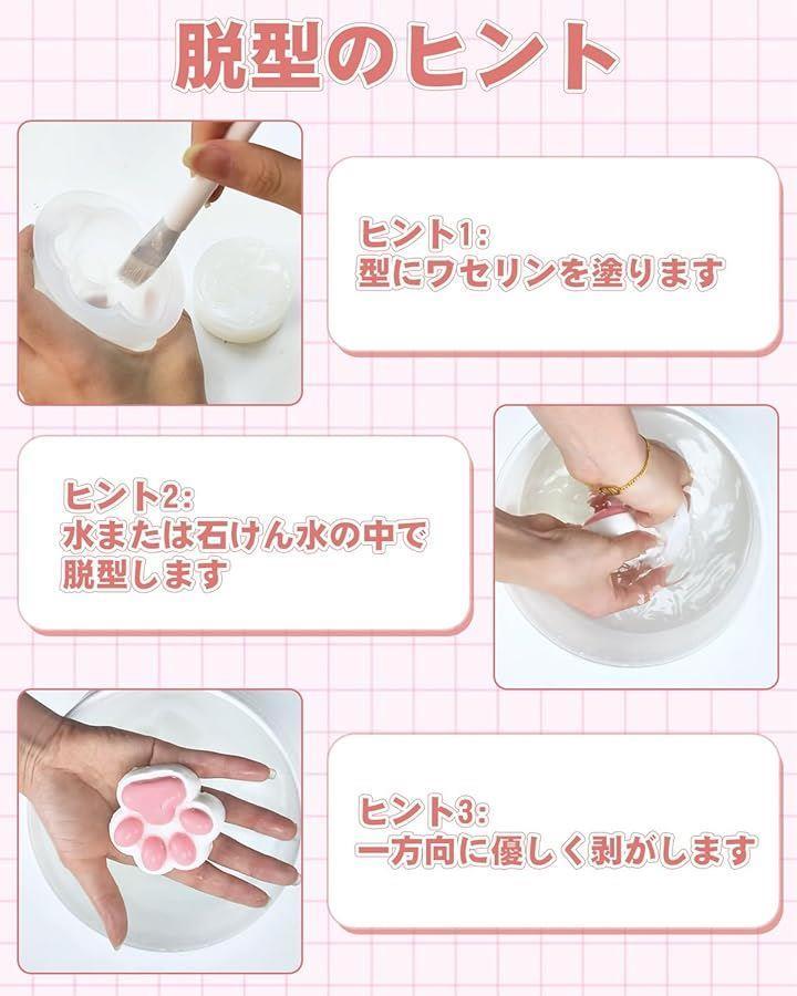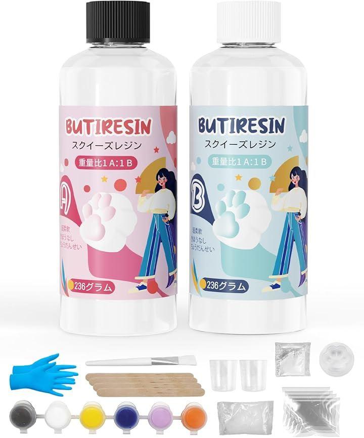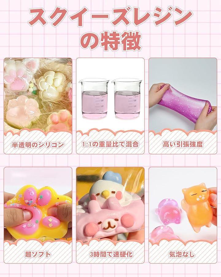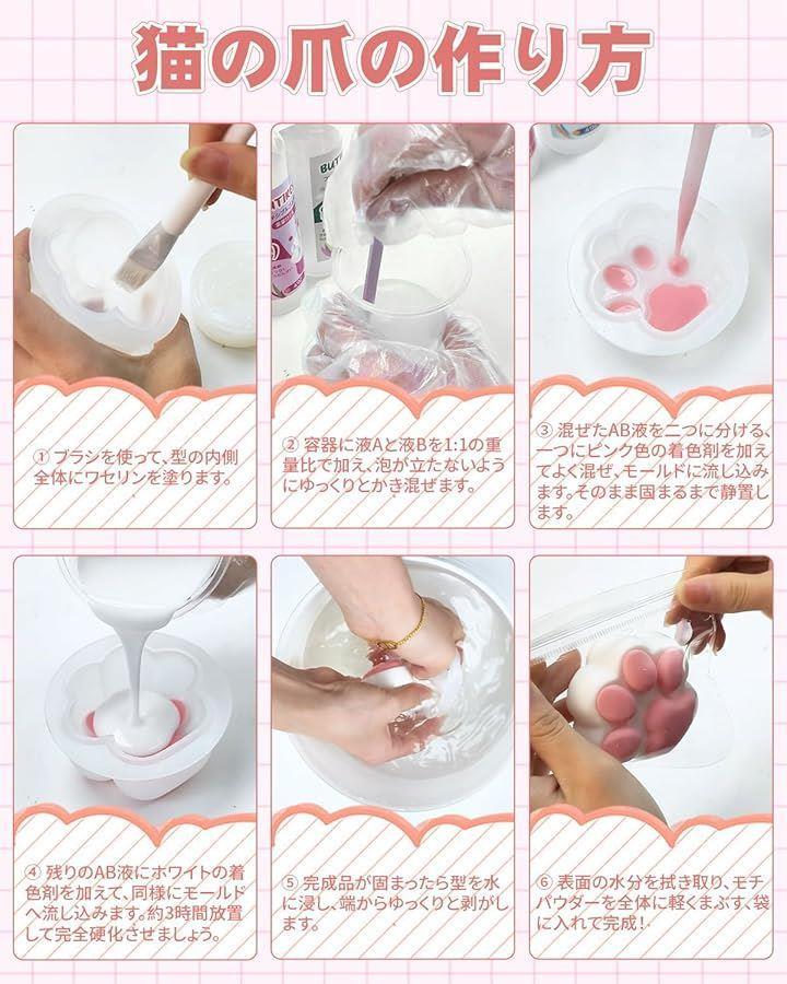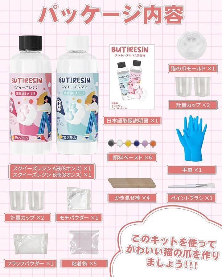 「お得なセット内容」スクイーズ レジン セット付属品: スクイーズレジン A液(8オンス)、スクイーズレジン B液(8オンス)、日本語取扱説明書、手袋、ペイントブラシ、猫の爪モールド、フラッフパウダー、モチパウダー、計量カップ、かき混ぜ棒、粘着袋、顔料ペースト。