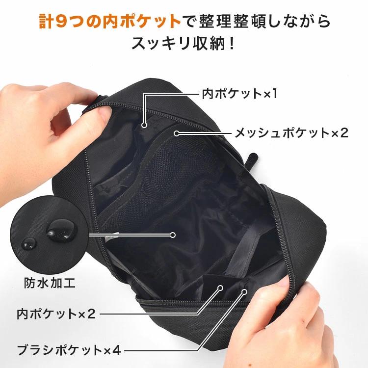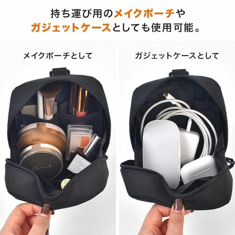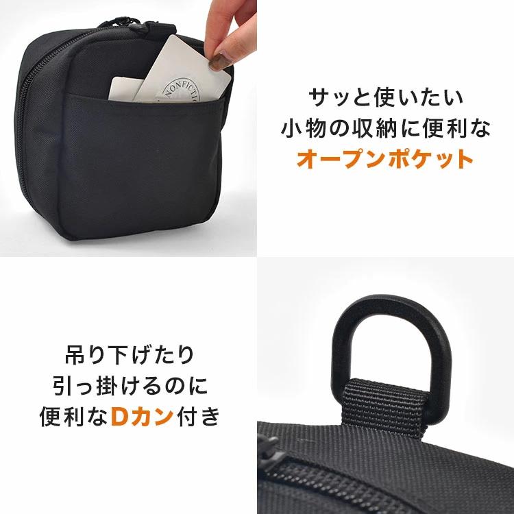 表生地は撥水加工、裏地は防水生地を使用。水回りや旅行先でも使いやすく、汚れにくいのも嬉しいポイントです。通勤・通学、旅行、アウトドアなど幅広いシーンで使える、機能性と収納力を兼ね備えたスクエアポーチです。