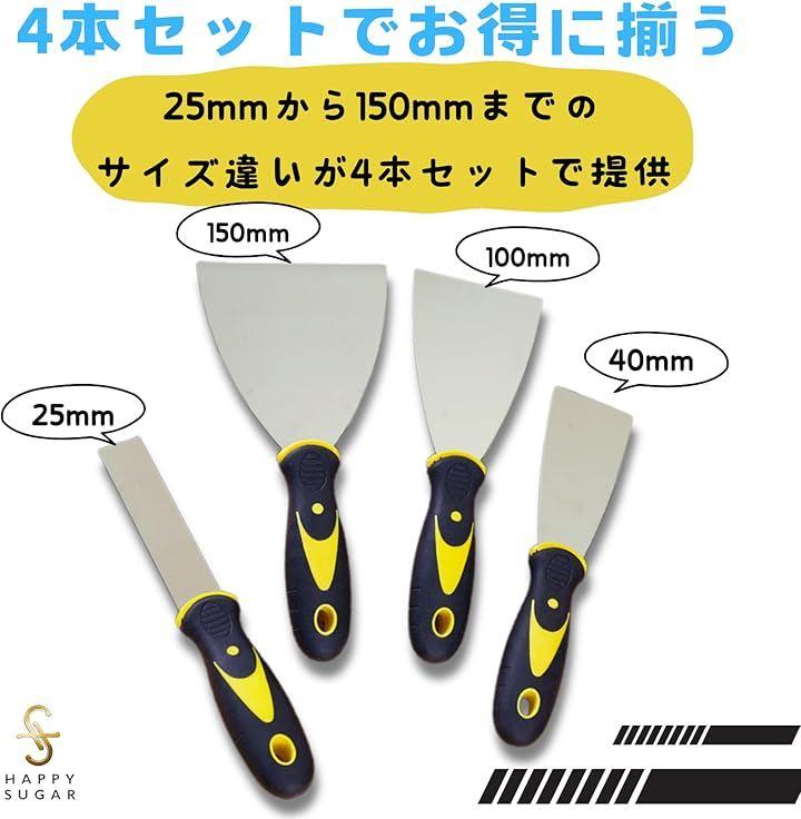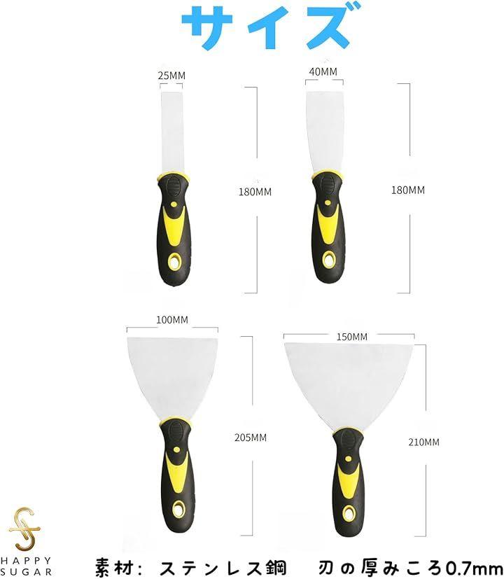 「商品詳細」(1)刃幅 25mm 全長180mm (2)刃幅 40mm 全長180mm (3)刃幅 100mm 全長205mm (4)刃幅 150mm 全長210mm 素材:ステンレス鋼 刃の厚みころ0.7mm
