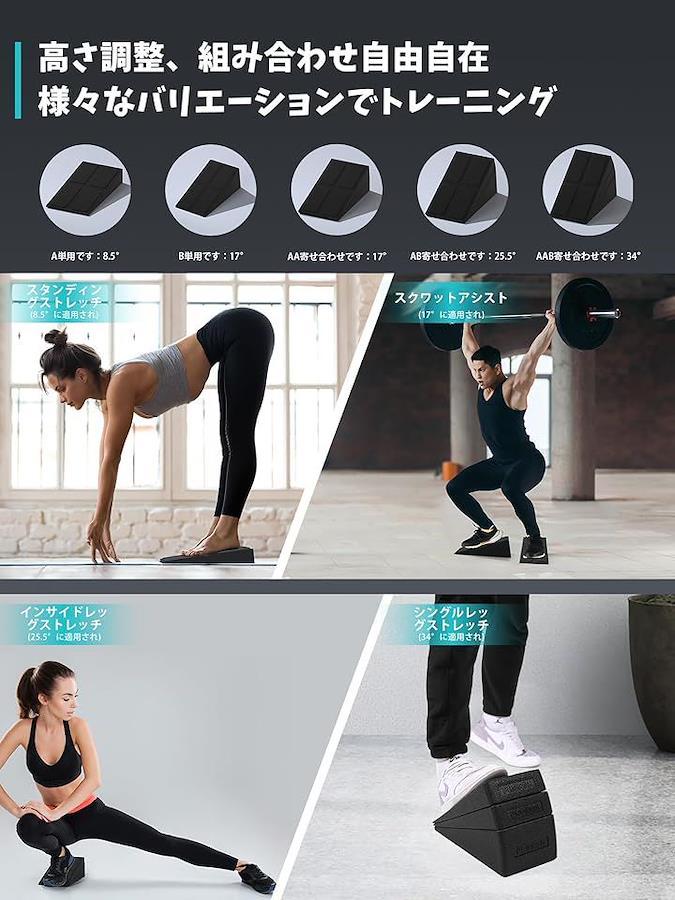 「5つの調整可能な角度」 スクワットウェッジブロックは8.5°、17°、25.5°、34°、180°に調整可能で、高難度のトレーニングを簡単に行えます。