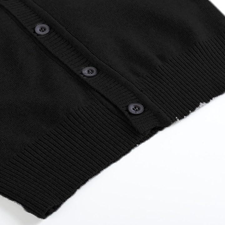 前開きボタン式、Vネック、襟、裾、袖口は全部リブあみ、シンプルで無地なデザインはどんな服と合わせても美しく見せます。
