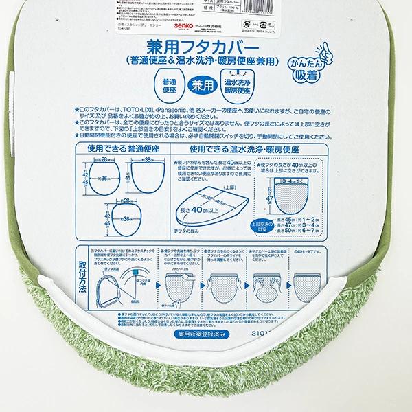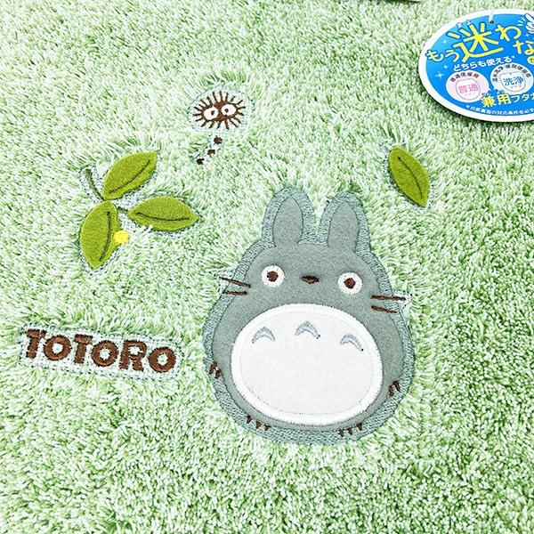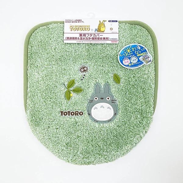 となりのトトロの兼用蓋カバー。タイプにかかわらず使っていただける吸着シート付きです(一部、お使いになれない便器がございます)。ゆったりとした森の中でくつろぐような優しいグリーンカラーの中にトトロの立体的な可愛いアップリケがアクセントに♪