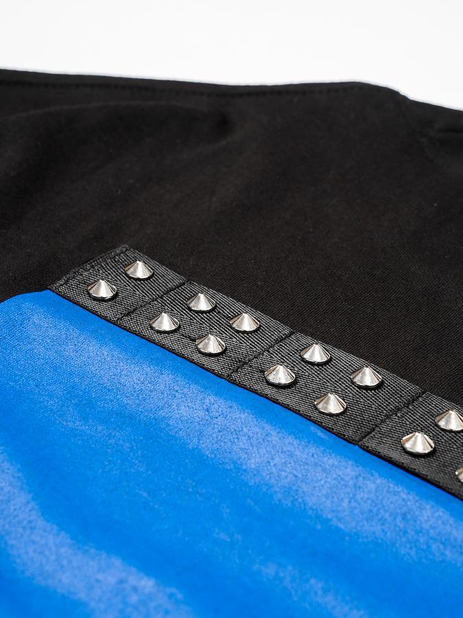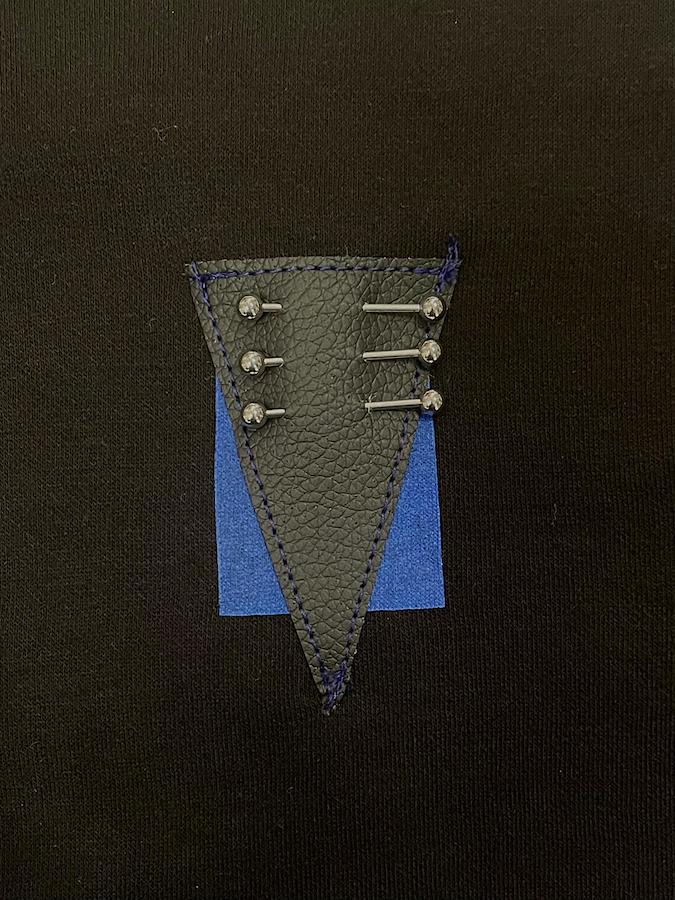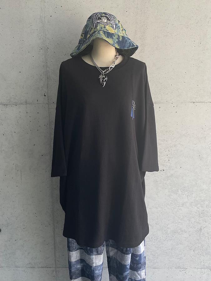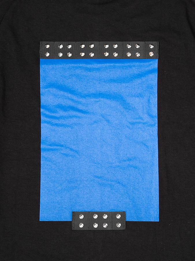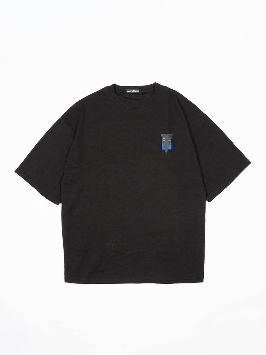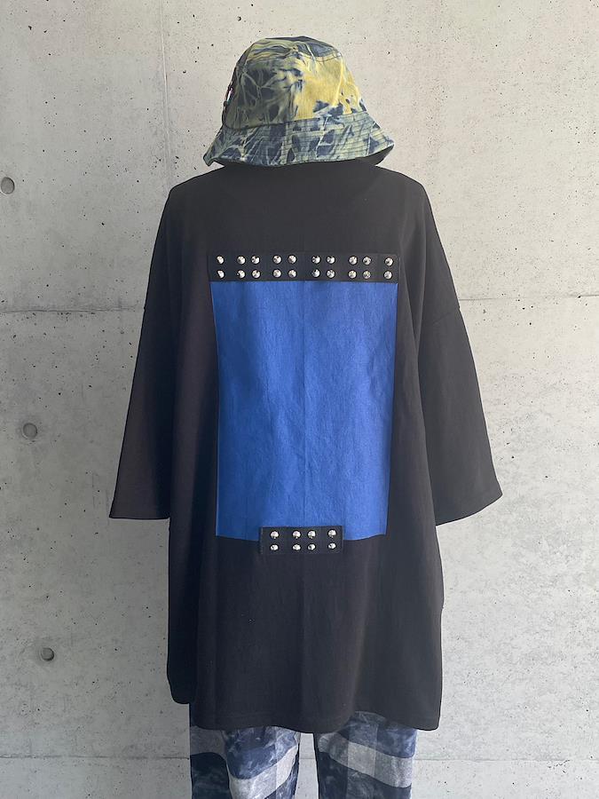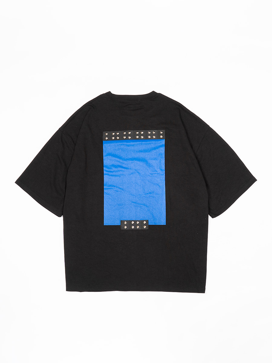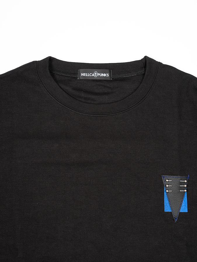 胸元の合皮パッチとバックのスタッズが特徴的なTシャツ。ブラックボディにブルーが映えるデザイン☆男女問わず着用可能なビッグシルエットです。