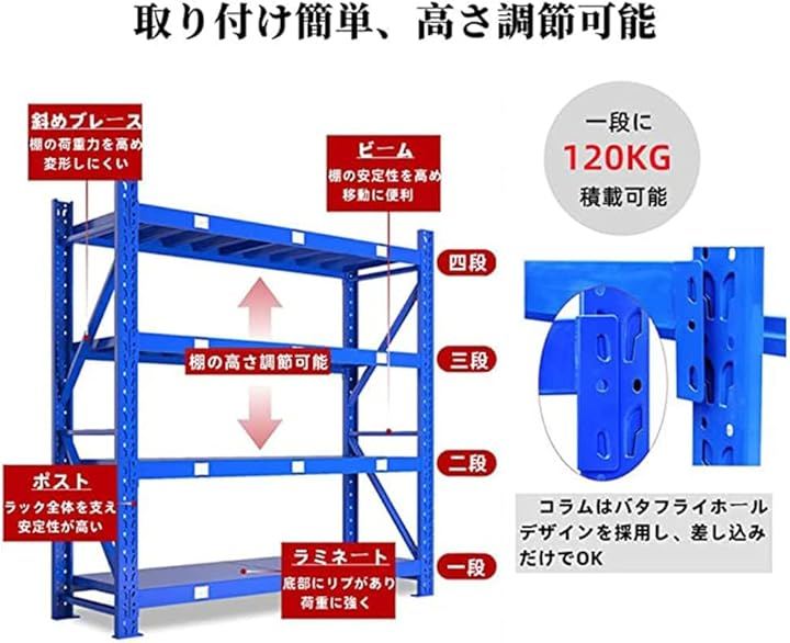 「用途」業務用スチールラック、重量物の多い大型倉庫や工場などの物品棚、商業施設や店舗での商品の展示販売用陳列棚、店舗バックヤードでの保管棚、オフィスの書庫や整理棚、一般家庭のキッチンラックやテレビボード、本棚、レージでのタイヤや工具の保管棚、物置き内の収納棚