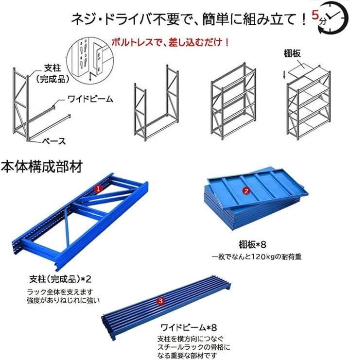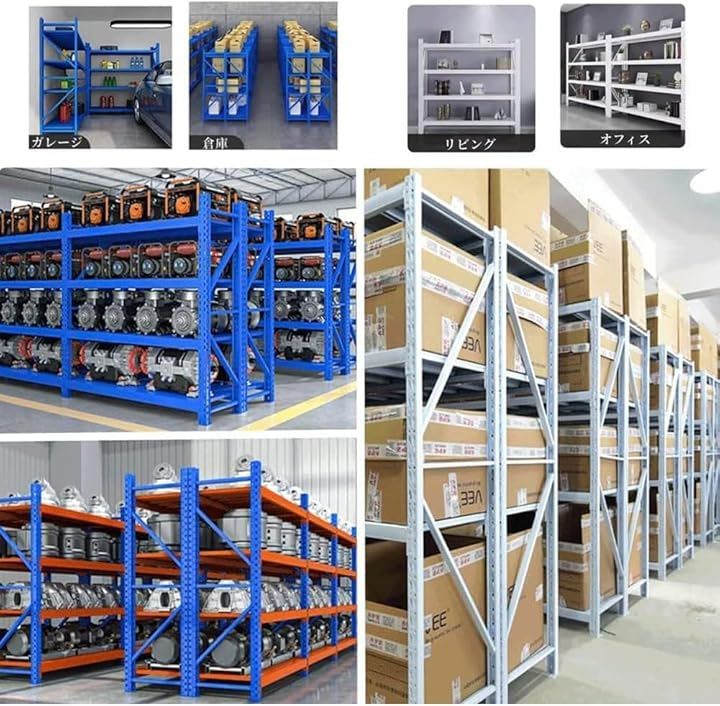 「用途」業務用スチールラック、重量物の多い大型倉庫や工場などの物品棚、商業施設や店舗での商品の展示販売用陳列棚、店舗バックヤードでの保管棚、オフィスの書庫や整理棚、一般家庭のキッチンラックやテレビボード、本棚、レージでのタイヤや工具の保管棚、物置き内の収納棚