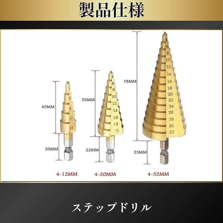 |「セット内容」ステップドリル3本(4–12/4–20/4–32mm)、面取りカッター6本(6/8/9/12/16/19mm・82°)、センターポンチx1。