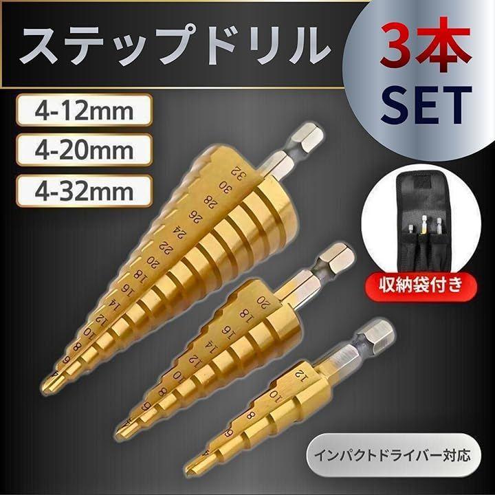 セット内容:ステップドリルx3(4–12/4–20/4–32mm)収納ポーチ、面取りカッターx6(6/8/9/12/16/19mm)、センターポンチx1