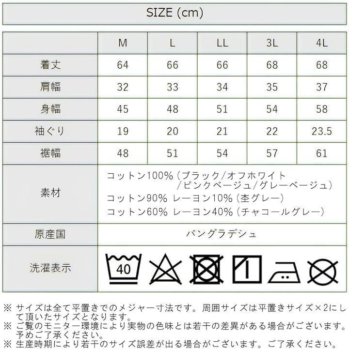 [LLサイズ]着丈:66cm、肩幅:34cm、身幅:51cm、袖ぐり:21cm、裾幅:54cm [3Lサイズ]着丈:68cm、肩幅:35cm、身幅:54cm、袖ぐり:22cm、裾幅:57cm